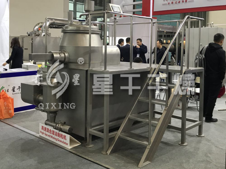 粉體物料與粘結(jié)劑在圓筒形(錐形)容器中,由底部混合漿充分混合成濕潤(rùn)軟材,然后由側(cè)置的高速粉碎漿切割成均勻的濕顆粒。
